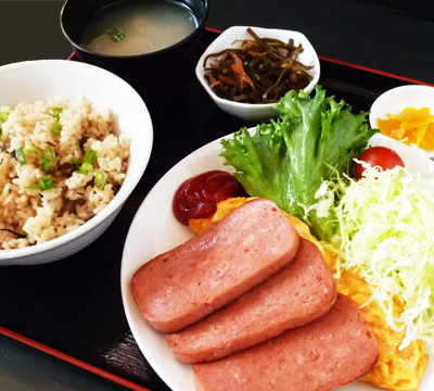 ポーク卵セット 1,200円(税込) 沖縄の大衆食堂で人気 |