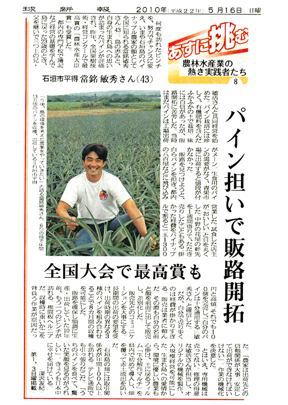 石垣島の當銘敏秀さんは2009年の『第10回全国果樹技術・経営コンクール』でその技術を認められ、石垣島はもちろん、沖縄県のパイナップル農家で初の農林水産大臣賞(最優秀賞)を受賞しました。